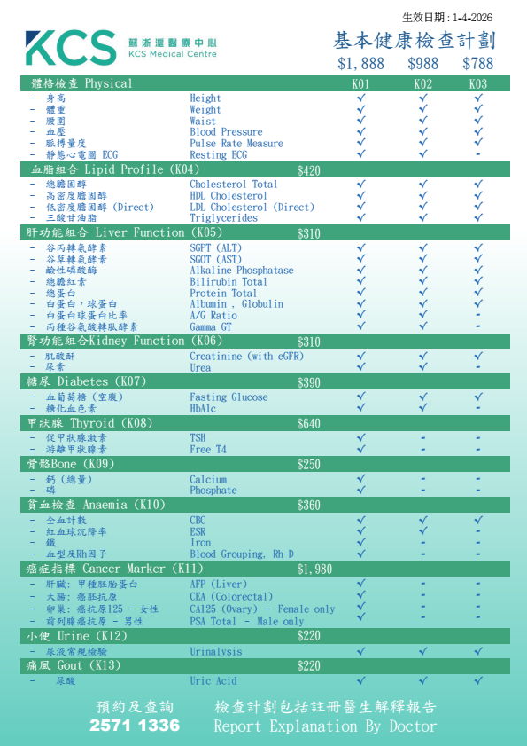 預防勝於治療,定期身體檢查非常重要,KCS身體檢查計劃價格實惠,包括 :